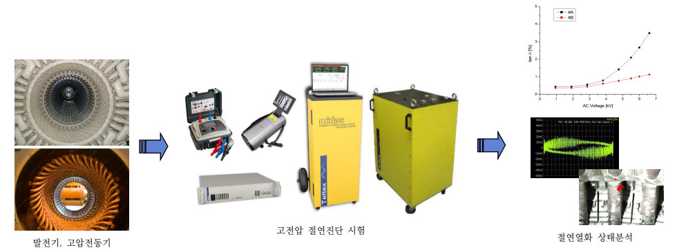 발전기, 고압전동기 고정자 권선에 대한 고전압 시험을 수행하고 그 결과를 분석하여 절연열화 상태평가 및 보완대책을 제시하는 서비스